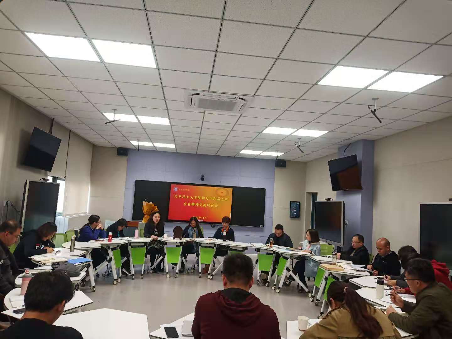 11月11日下午3点,威廉希尔williamhill官网组织全体教师在长清校区智慧教室召开了十九届五中全会精神交流研讨会,各教研室教师代表分享了个人学习十九届五中全会公报的心得体会,大家针对“十九届五中全会精神如何进思政课堂”的问题进行了热烈的讨论。